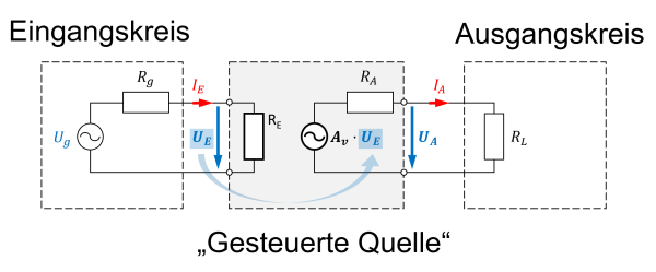Das zu verstärkende Signal kommt auf der linken Seite von einer beliebigen Quelle. Häufig lässt sich diese als ideale (Spannungs)quelle - d.h. mit Innenwiderstand - auffassen. Das verstärkte Signal wird auf der rechten Seite einer Last zugeführt. Im einfachsten Fall ist diese Last ein ohmscher Widerstand.